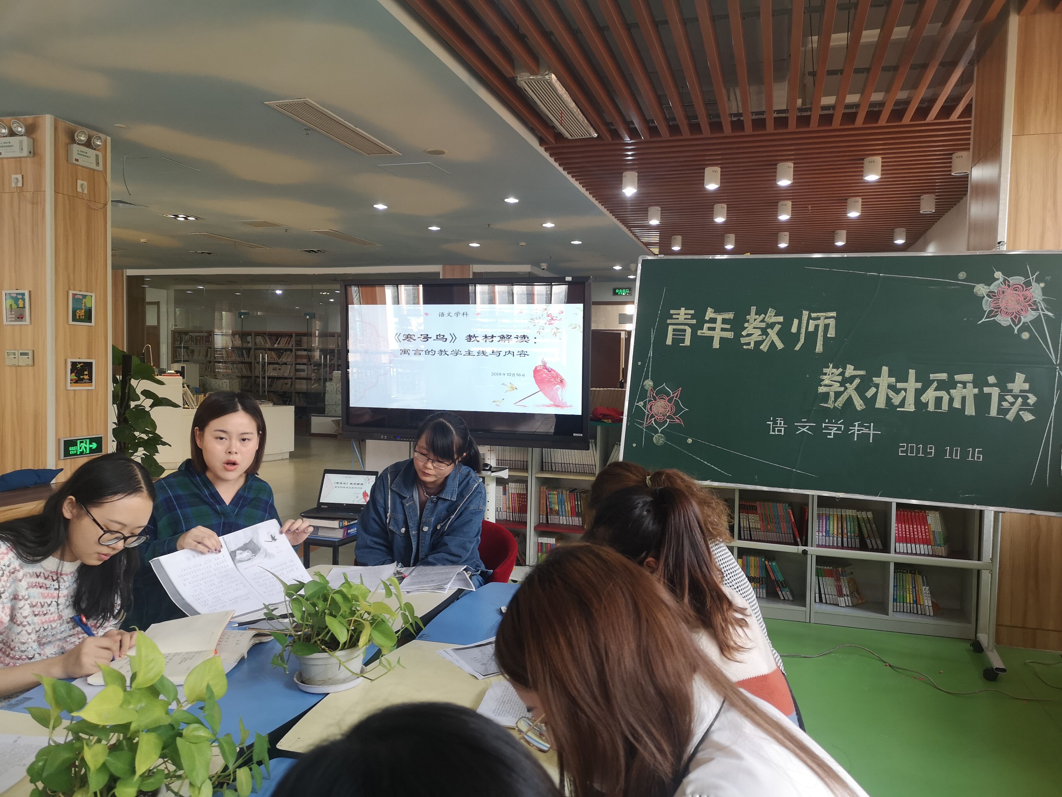 10月16日下午,在书香弥漫的图书馆中,我校顺利开展了语文青年教师教材研读班的第一次研读活动,十三位青年教师在乔校长和葛老师的带领下,就部编版语文二年级上册《寒号鸟》一文发表了自己的教学设想,大家各抒己见,精彩纷呈。
